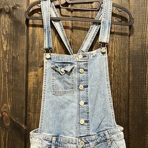 Hollister brand denim overalls. Size medium. Stretch. Low rise. Button front with pocket. Criss cross back. Vintage inspired with modern flair. Distressed overall look. Preloved. Please see all photos for condition. Cute boho chic style. Stock photos are for style & fit reference only, not a representation of condition.