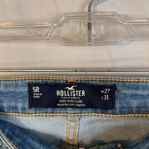 High rise, flare, 5 pocket, Hollister soft stretch, raw hem, patches