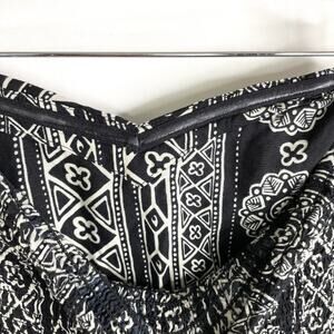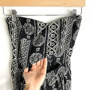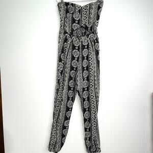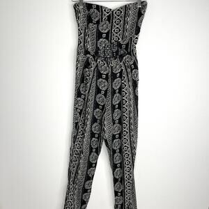 Hollister black and white tribal print strapless jumpsuit with large peek-a-boo opening on stomach. Super comfortable and waist is stretchy. Top has a rubber strip to keep from falling down. Size small but best for those with a larger bust to keep the top up. I am a 32D and this jumpsuit fit great and was very cute but the top was too large :(. In great condition!