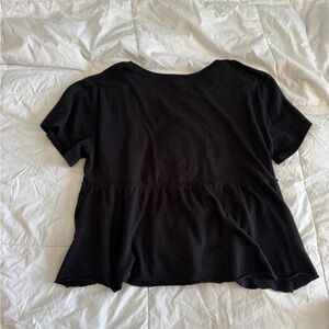 Adorable black short sleeve peplum-style baby tee from Hollister in size XS. Features a soft cotton blend, crew neckline, and flattering gathered waist. Lightweight and comfortable, perfect for casual wear or layering. Gently worn with no flaws. Approx. length is 20 inches from shoulder to hem. Made in Vietnam.
