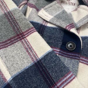 Keep warm and stylish with the Hollister Plaid Jacket. Featuring a classic cream and blue plaid design, this jacket is perfect for any occasion.