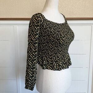 Vintage Hollister smocked top with dainty yellow and green flowers on a black background. Black with yellow floral print