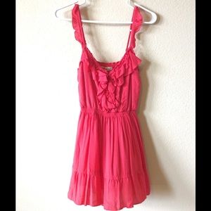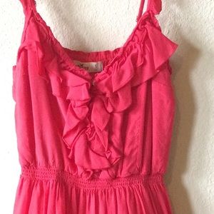 Red dress with ruffle front and adjustable straps. Super cute with a thick high waist belt and wedges.