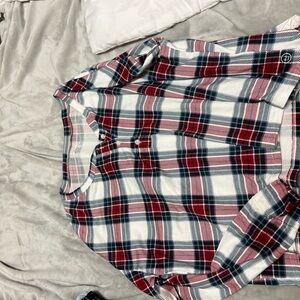 Stylish plaid top. Features red and blue pattern. Button-up design. Perfect for casual wear. SUPER SOFT!