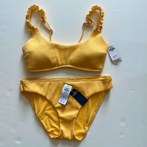 NEW WITH TAGS Hollister Mustard Yellow Ribbed Ruffle Bikini. Large top, XL bottom. Bottoms fit L or XL