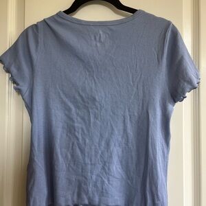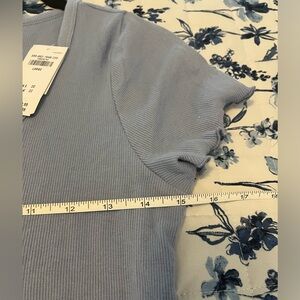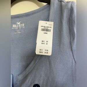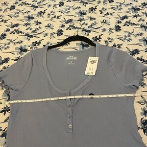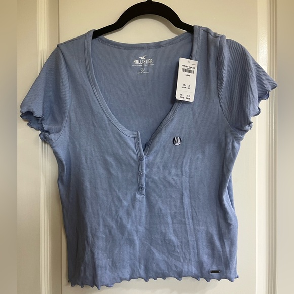 Hollister blue ribbed top. Has buttons on the front, sleeves and bottom have ruffled edges. Size L. NWT.