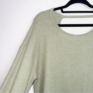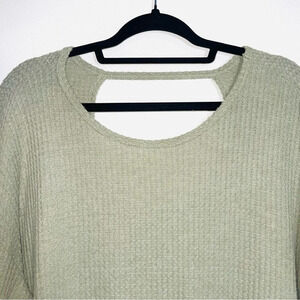 Hollister sage green waffle knit top. In excellent condition! Scoop neckline. Long sleeves. Fitted cuffs. Elastic tie waistline. Large keyhole back. Slightly cropped. Soft waffle knit material. Sage green color. Size medium.
