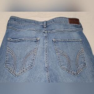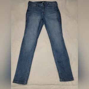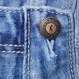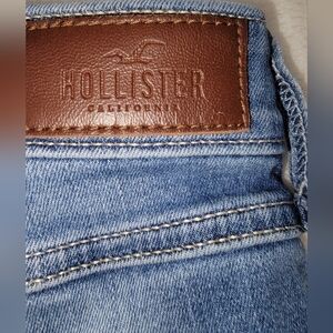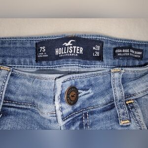 These Hollister skinny jeans offer a sleek silhouette in a classic blue shade, enhanced by natural distressing and subtle fading. The denim's medium wash and whiskering effects provide a modern, lived-in look, perfect for any casual occasion.