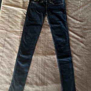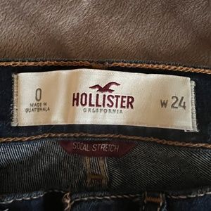 Hollister dark wash jeans with caramel/tan stitching and signature Hollister pocket designs. No fading and in like new quality besides a few tiny snags (as pictured) that are more obvious because of the really dark, solid wash and the inside not being died dark. Functional front and back pockets do more of a true jean than a jegging but still have a good amount of stretch for comfort.