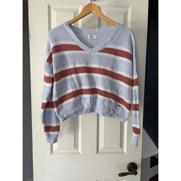 Trendy Hollister knit sweater in women’s size XXS. Features a V-neckline, long sleeves, and a cropped fit. Light blue base with red and white horizontal stripes. Ribbed hem and cuffs. Perfect for casual wear, layering, or fall outfits.