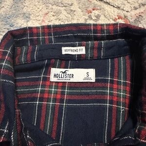 Cozy Hollister flannel with tartan pattern. Features navy, red, and green colors. Perfect for casual wear.