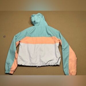 Vibrant bomber jacket with hood. Features teal and peach colorblock. Perfect for casual outings. Pit to pit 19.5”