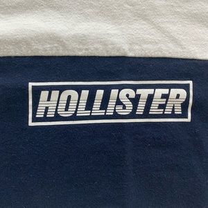 A Navy and White Hollister Short Sleeve Tee Shirt. There is a batters of the white shirt with a baby stripe across the chest with the Hollister letters spelt out in white