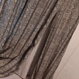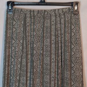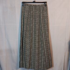 This tribal patterned maxi skirt is perfect for any occasion. Size Small with an elastic waist measuring 14" laying flat, a length of 39" and a front side 24" slit. The intricate design adds a touch of sophistication to your wardrobe. Pair it with your favorite top for a chic look.