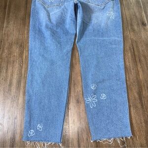 Style: straight leg, casual, classic, mom jeans high waisted, light blue wash, whiskered, 90s, raw hem, floral fronted, funky, retro, daisy, girly cute