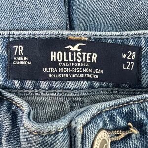 Hollister ultra high rise mom jean. Vintage stretch. High-rise. 5-pocket. Belt loops. Whiskered. Lightly distressed. Medium wash. Raw bottom hem. In good used condition. No stains, tears or holes.
