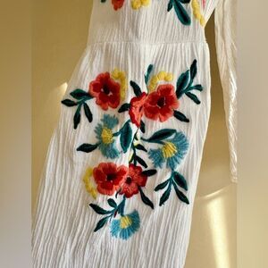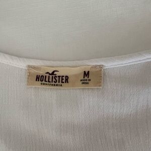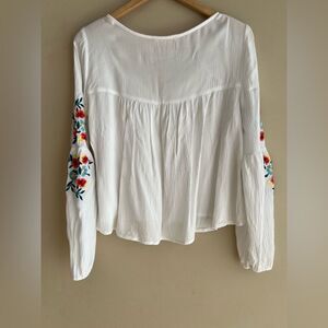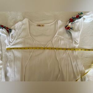 This stylish white blouse from Hollister features a cropped design with intricate floral embroidery on the sleeves, adding a bohemian flair to your look. The lightweight fabric and relaxed fit ensure comfort and elegance, making it a versatile addition to any wardrobe. Light and airy, perfect for summer! Size medium.