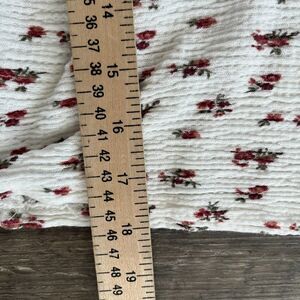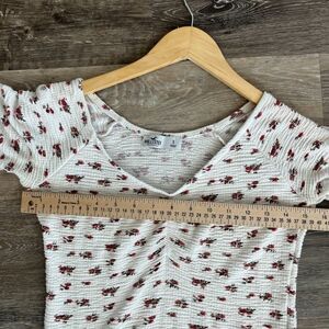 White long sleeve tee with floral print. V-neck design. Comfortable and stylish.
