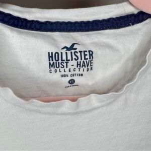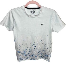 Stylish white t-shirt with blue splatter design. Features a small logo on the chest.