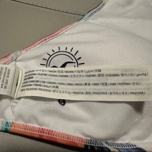This is a pre-owned Hollister Swim bikini top, size S, made in China. It features a vibrant floral print with a halter neckline and a criss-cross lace-up detail in the back. The fabric composition is 88% nylon and 12% elastane for the outer shell, and 100% polyester for the lining. The top has a metal clasp closure at the back and appears to be in good condition with no visible signs of significant wear or damage.