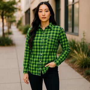 Hollister Womens Blouse Sz M Lime Green Blue Check Long Sleeve Button Up Cotton Shirt