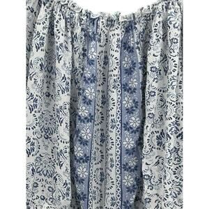 This Hollister Co women's blouse features a beautiful floral pattern with a white and blue color scheme. The off-the-shoulder neckline and long sleeves provide a feminine touch, while the tie front closure and ruffle accents add a bohemian flair. The lightweight and stretchy viscose material make it suitable for all seasons.