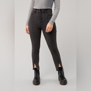 Trendy Hollister women’s jeans in washed black/charcoal gray. Ultra high-rise, skinny ankle fit with flattering front seam detail. Features raw hem with front ankle slits for an edgy look. Soft stretch denim, super comfortable and stylish.