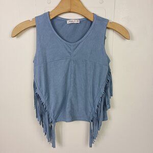 This is a light blue Hollister tank top. It has a crocheted or lacy overlay on the front with a geometric and floral pattern. The straps have a unique design, crossing in the back