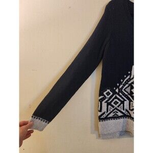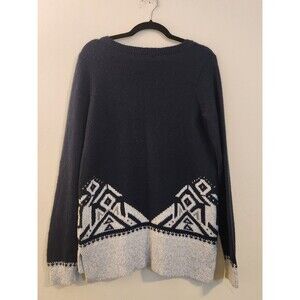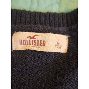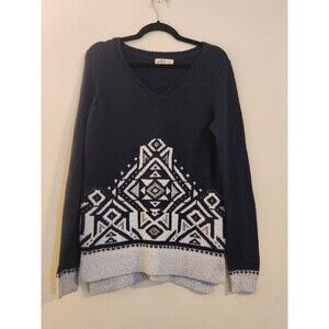 **Please see picture for small hole in top left shoulder of sweater***Hollister Women's Large Navy Blue/Gray Pullover V-Neck Sweater features a geometric design in a tight-knit fabric. The sweater has long raglan sleeves and a collarless style, making it lightweight and suitable for the Winter and Fall seasons. The color scheme is blue and gray, with a designer, Aztec-inspired theme. Made of polyester, cotton, and acrylic, this sweater should be hand washed. It is a regular fit and offers a trendy, colorful look with a touch of retro style.