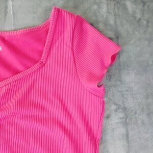 This Hollister women’s ribbed knit top in size Medium comes in a vibrant pink shade with a ruched front detail and short sleeves. The stretchy ribbed fabric provides a flattering fit, perfect for casual everyday wear or a Y2K-inspired look.