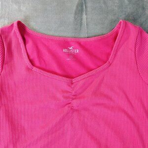 hollister, ribbed knit top, pink ruched shirt, hollister california, y2k fashion, womens casual tee, short sleeve ribbed top, everyday wear, stretchy knit shirt, summer casual