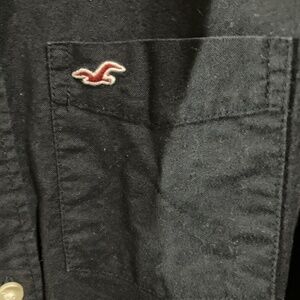 Soft, stylish, and comfortable! This Hollister long sleeve button-down shirt features a navy blue color with just the right amount of stretch for a flattering, flexible fit. Lightweight cotton blend material with the signature Hollister logo on the front chest pocket.