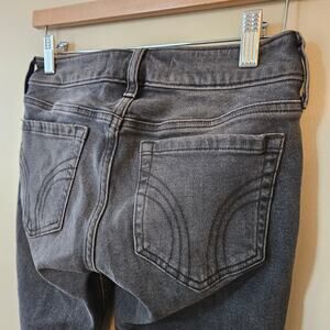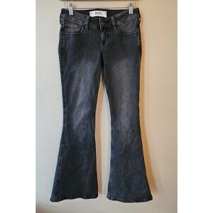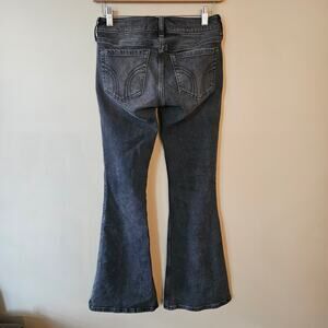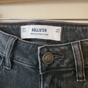 Sold out--from this season! Hollister women's ultra low-rise flare leg jeans in washed black (gray), size 000s (waist size 23) short. Comfortable jeans in vintage stretch denim designed with a ultra-low rise waist and flared hem. Washed black with fading.