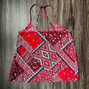 Hollister women's size XS red, whit, and blue bandana print racer back adjustable spaghetti tank blouse. In excellent condition from a smoke free home.