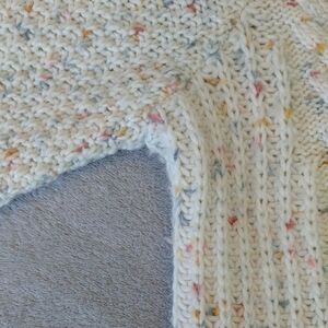 Good used condition, with no stains or tears. A cute and charming cream sweater. Features multicolor confetti speckles, a round neck, and cable knit details at the front and sleeves. There is some light piling; please see close-up photos.
