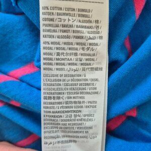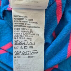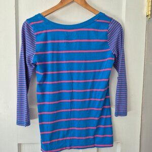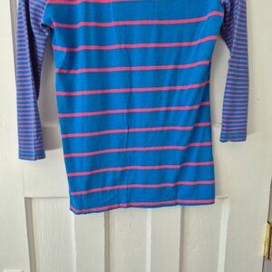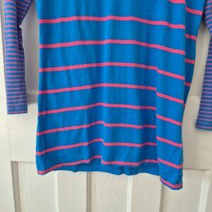 Vibrant blue top with pink stripes. Features a scoop neckline and long sleeves. Perfect for casual wear.