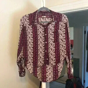 Hollister button down shirt.  Measurements are 19” from armpit to armpit and 19” in length in front & 24” in back. Purplish-red color.