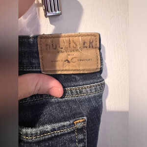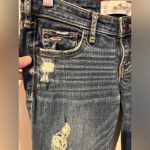Hollister denim size W26, L35, with factory distressing and wiskering.