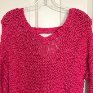 Hollister magenta/ fuchsia pink chunky knit sweater with cutout back, split hem, v-neck and oversized fit. Soft, on trend color and exposed seams. Comfortable yet sexy. Size extra small but will fit small too - approximate measurements: 21 inches pit to pit, 25 inches shoulder to hem in front, 28 inches shoulder to hem in the back. Very good preowned condition.
