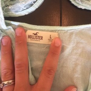 Hollister mint green button-up tank w-Lacey cut-out in the back. Size is large, but this could definitely fit a medium. Semi-sheer, lightweight material