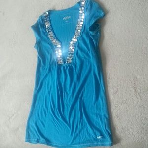 Beautiful and lined with silver sequins. Thin comfy and light material. Shines beautifully in the light and has a plunging neckline. Long enough that it has less if a chance of riding up. Perfect Hollister top. Says made in Peru. Please ask any and all questions before bidding! Thx!