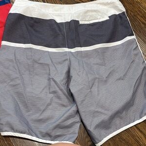 Items are used the gray swim shorts are more under the knee and the red ones are more above the knee