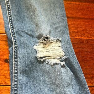Stylish distressed blue flare jeans perfect for a casual look. Comfortable and trendy, these jeans are a must-have for your wardrobe.