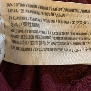 Burgundy Junior’s skinny pants. Stretch fabric. Back pockets. Belt loops. Button and zip closure. 98% cotton/2% spandex. Size: 1R. W25xL31. Preowned in good condition.