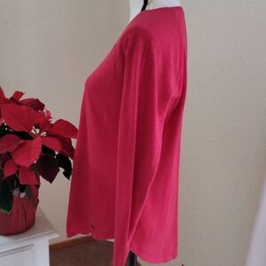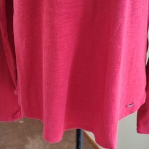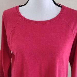 Cotton/viscose blend long sleeve top. Round neck, raglan sleeves. Slightly curved bottom hem. Size S measures 38 at chest, 40 at waist, 46 at curved bottom hem. 24-28 long from shoulder to hem. Easy and comfortable.