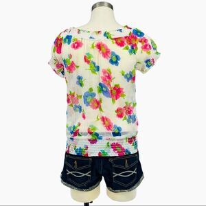 Sheer short sleeve peasant blouse. White base with tropical floral print. Smocked neckline (with tassel drawstrings), cuffs, and hemline. Material stretches at smock. Versatile, as you can wear a cami, bandeau, or just a nude bra. Pairs best with jean/khaki shorts. Breathable, perfect for summer. Discounted style. Smoke-free & pet-free home.