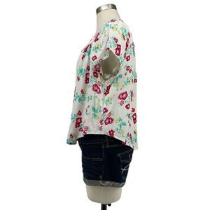 Short sleeve tropical floral blouse. Flowy loose fitting shirt. Split neck collar. High-low hemline. Hollister branding tag on left outer seam (Photo #6). Soft and breathable material. Perfect for summer. Pairs well with jean shorts and flip flops. Super cute with messy bun or French braids. Discontinued style. Smoke-free and pet-free home.
