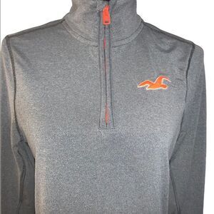 Gray and orange fitted pullover athletic top. Long sleeve with thumb holes. 1/3 zip. Logo on left chest. Side left pocket with zip closure. Stretch fabric. 95% polyester/5% elastane. Size: small. Preowned in good condition.