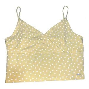 Hollister's Must-Have Crop Wrap Cami Yellow Pattern MUST-HAVE COLLECTION The go-with-everything outfit starters you'll reach for every day. Designed in soft, stretch cotton fabric with a wrap-front bust, v neckline, adjustable shoulder straps, and crop length. Slim Fit. Imported. Body And Lining:95% Cotton, 5% Elastane
