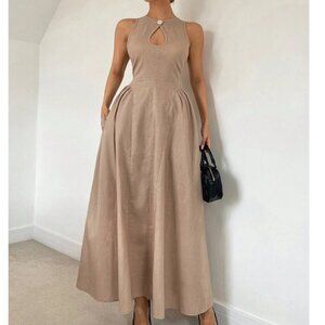 Hollow Front Cinched Waist A-Line Side Ruched Maxi Dress tan